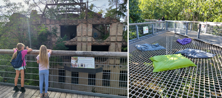 Die Aufregung war schon nicht mehr so groß wie noch vor der Führung, dafür wurde diesmal eine richtige Fotosession daraus. Genau wie an der Riesenhängematte mit ihren großen Sitzkissen. Die wurde zuerst nur vorsichtig wie ein rohes Ei betreten, dann aber schnell zur Spielwiese, die sie gar nicht mehr verlassen wollten. Ich genoss in der Zeit den Blick von oben auf die Alte Chirurgie mit ihren kunstvoll bepflanzten Balkonen. Weiter ging es dann ganz gemütlich. Das Zittergitter, das, anders als der Rest des Pfades, mit seinem Holzbelag den Blick nach unten freigab, war nach der Riesenhängematte und der Sky-Boa keine ganz große Herausforderung mehr, aber doch ein kleines Highlight. Toll war, dass der Pfad mit seiner Gesamtlänge von 700 Metern auch den Blick von oben auf das Alpenhaus ermöglichte. Erst von dort wurde das ganze Ausmaß des Gebäudes erahnbar. Auch die vielen Bäume und Sträucher, die aus dem Gemäuer und auf dem Dach wachsen, waren aus dieser Perspektive nochmal beeindruckender. Die Infotafeln zu den vielen unterschiedlichen Baumarten auf dem Areal wurden zumindest sporadisch gelesen und dabei noch die eine oder andere Englischvokabel wie blossom oder leaf gelernt.